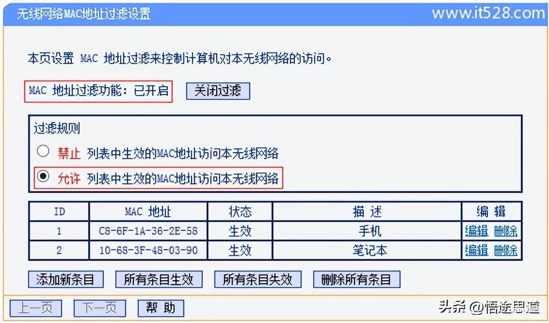 “无线MAC地址过滤”功能,可以用来限制哪些无线设备可以连接wifi上网的,与手机来电的“白名单”、“黑名单”功能类似。设置方法如下:
