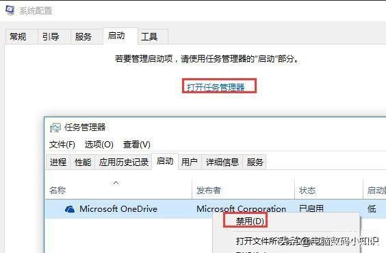 6、再点击“启动-打开任务管理器”,将启动项全部禁用,点击确定,最后重启系统即可。