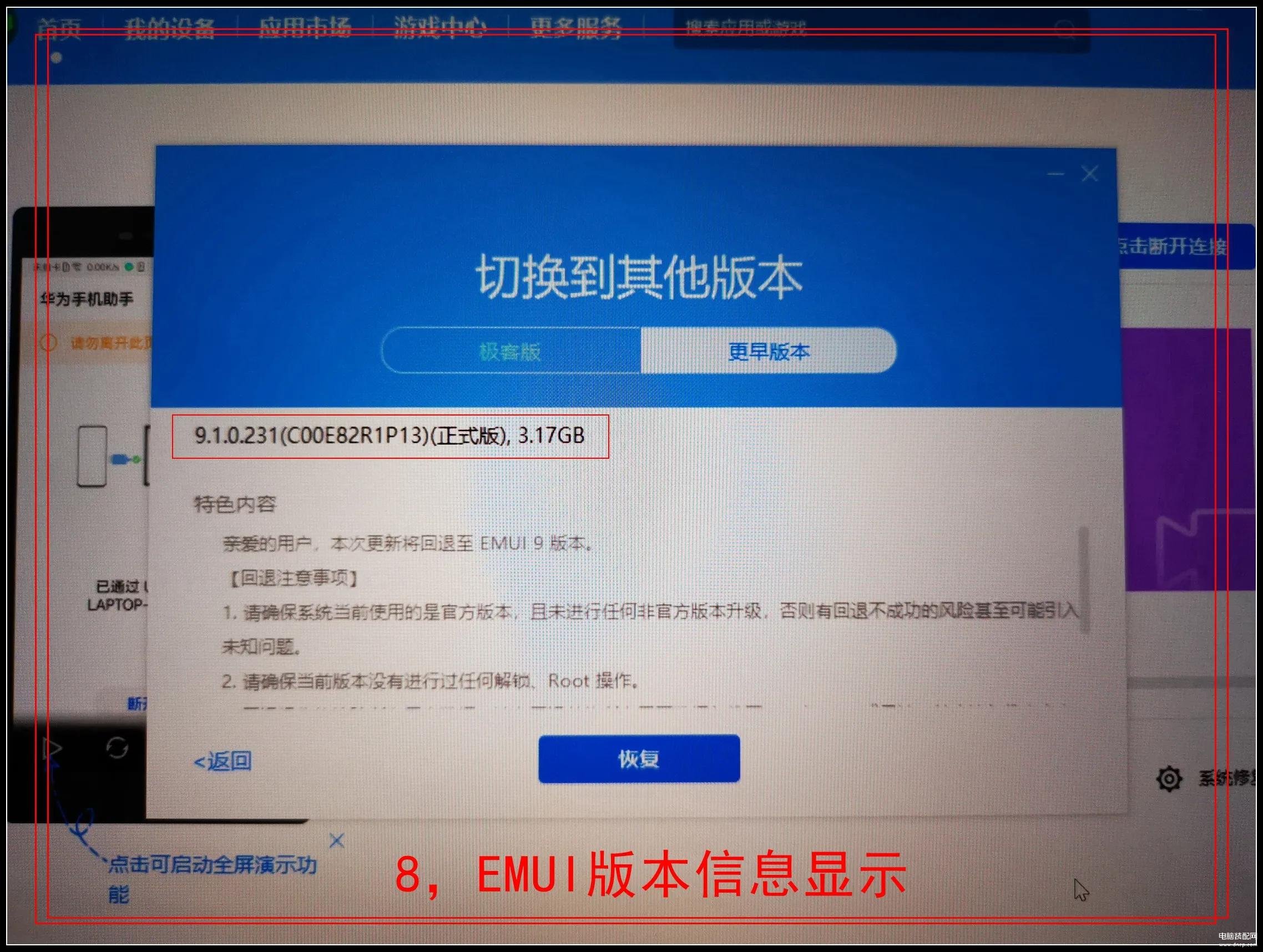 此时还会有关于鸿蒙系统的最后提示,点击“回退”,开始下载;