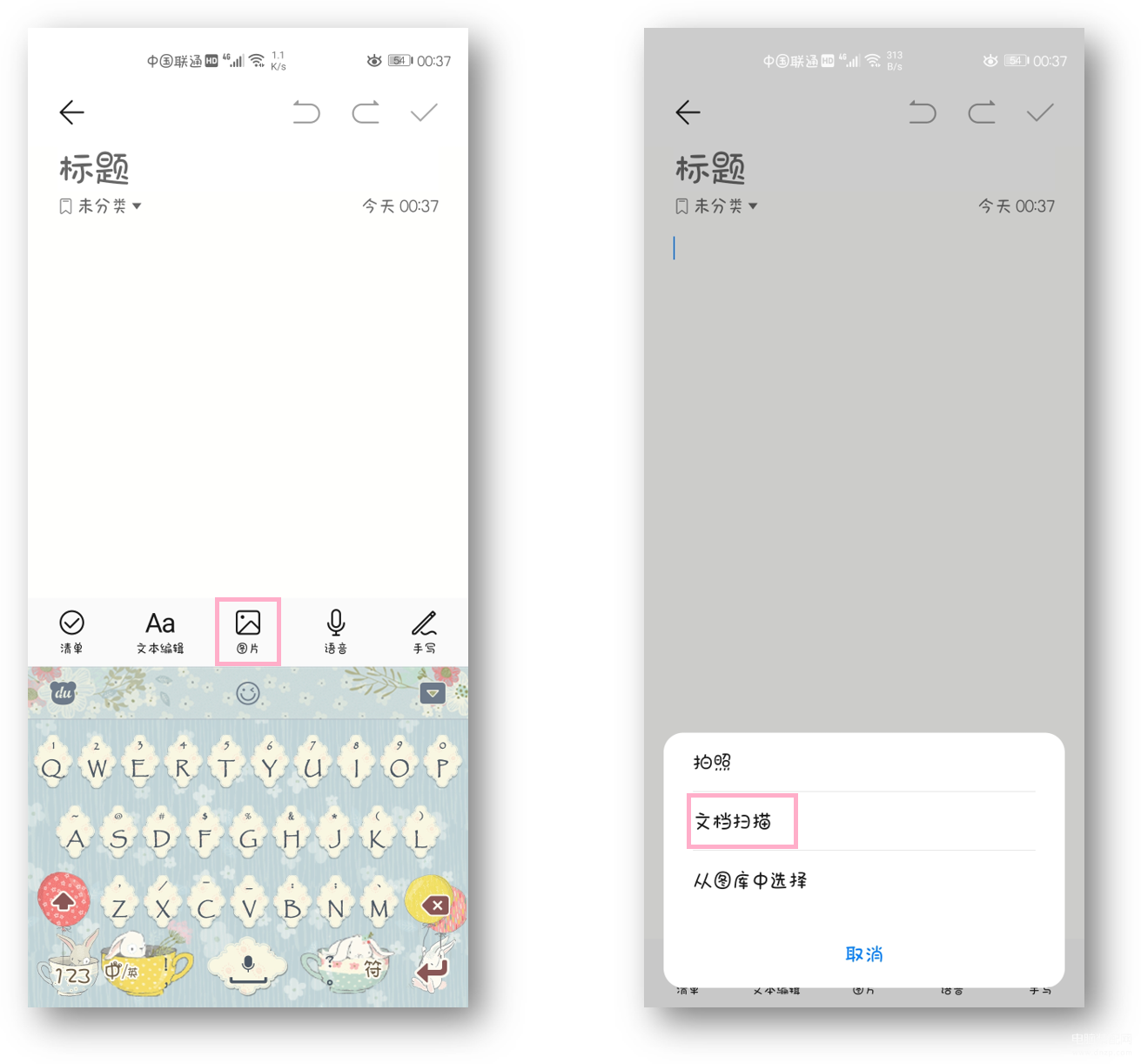 直接点击备忘录里面的图片功能,就能看见文档扫描,进行拍照识别。