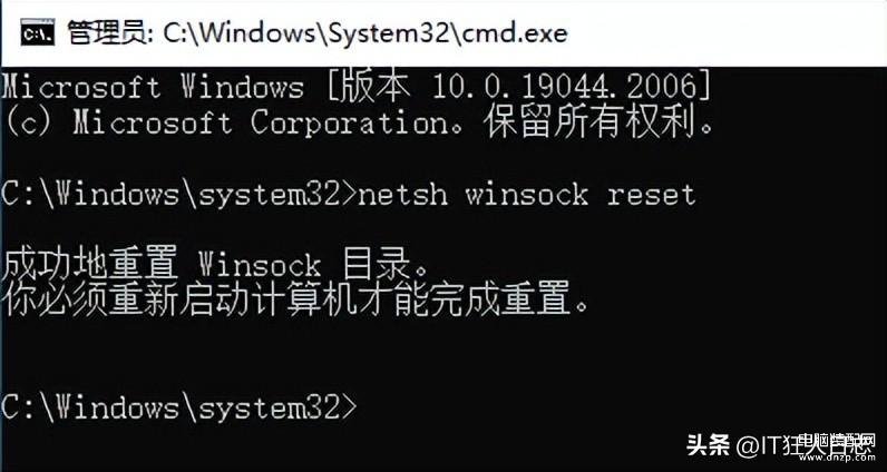 用管理员身份打开CMD命令窗口,支行命令:netsh winsock reset,考虑到有可能是Winsock协议配置出了问题,所以使用这个命令,重置Winsock协议配置。