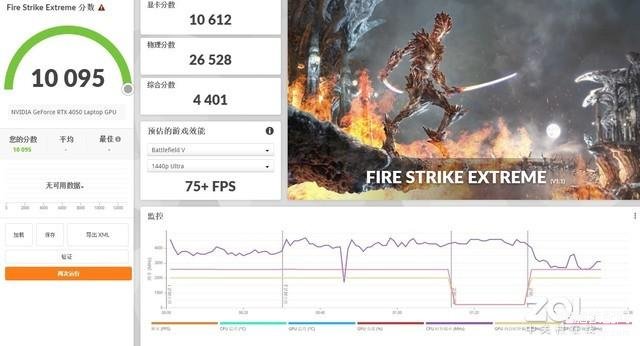 光追Port Royal评分高达4786,这意味着RTX 4050显卡已经达到了上一代RTX 3060的水准,再加上DLSS3支持,光追游戏体验会比RTX 3060更好;Time Spy DX12测试模式评分8681分;Fire Strike Extreme DX11模式评分10612分,其综合图形性能与RTX 3060相仿,而且达到相同性能所需的功耗更低。