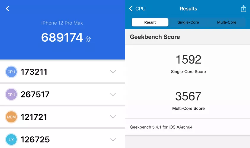 测试设备 iPhone 12 PM,iOS 15.0.2 安兔兔跑分结果为:689174,而上一个 15.0.1 正式版跑分为:668495。而 Geekbench5 跑分:单(1592)多(3567)。