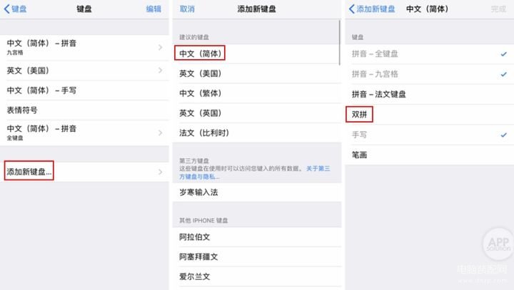 iPhone 在 iOS 11 中添加了「双拼」输入法。在「设置」-「通用」-「键盘」-「添加新键盘」-「中文(简体/繁体)」-「双拼」里即可以添加双拼输入法。