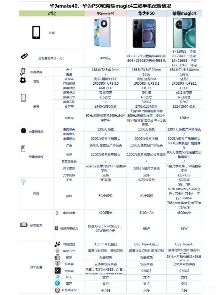 理由四:在三款手机当中,荣耀magic4这款手机的电池容量是最大的。荣耀magic4这款手机所搭载的电池容量为4800毫安。而另外两款手机所搭载的电池容量则分别为4200毫安(华为mate40)和4100毫安(华为P50)。所以综合以上几点原因,个人是更加推荐大家购买荣耀magic4这款手机的。这三款手机的核心配置对比情况请参考下图,