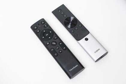 遥控器部分两设无论在体积上, 还是人体工学上都非常类似,握持的手感都很舒适。都设有语音识别的按钮,按下后可以用语音给投影仪发送命令。