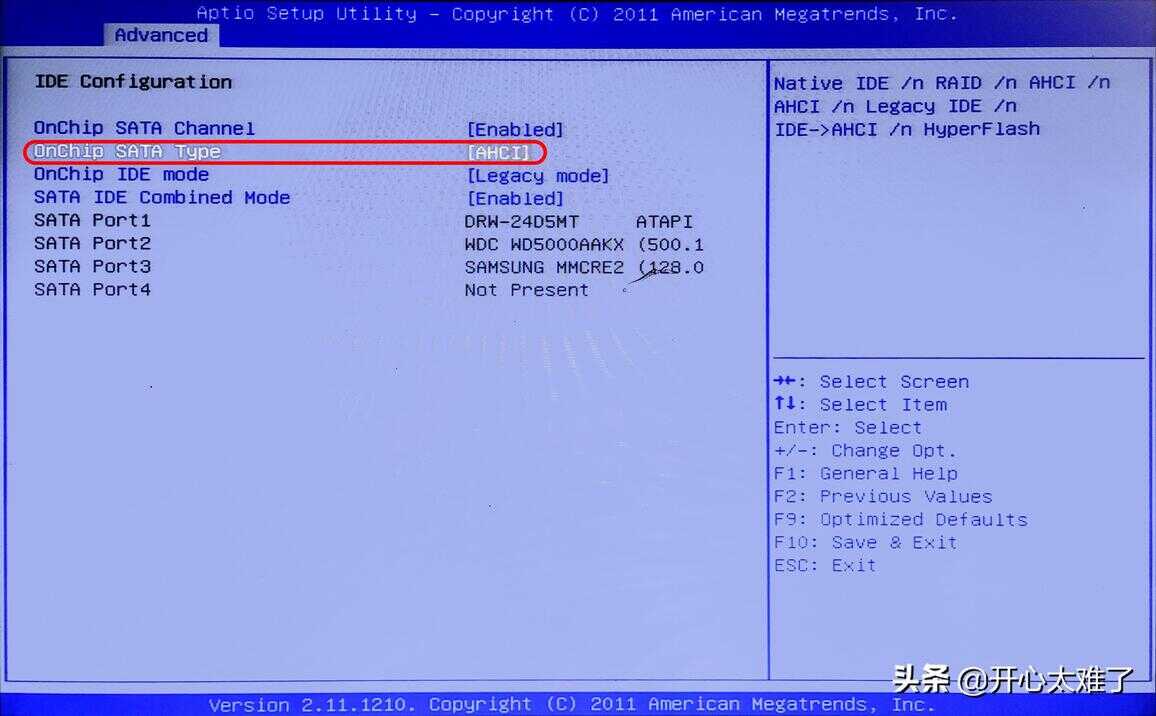 如果这个选项的值是“AHCI”更改为传统的“IDE”模式。如果是“IDE”更改为“AHCI”。然后按“F10”键保存设置。部分电脑是“F4”键保存设置。电脑重启启动以后,你会惊奇地发现,电脑能够正常进入桌面了。大概有10%的电脑开机蓝屏就是这个硬盘模式设置错误造成的。
