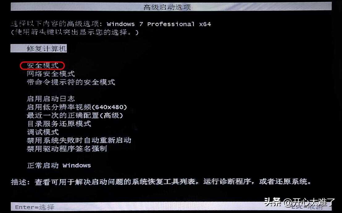 如果“最近一次正确配置”仍旧不能解决问题,重新启动计算机,重复上面的操作,最后选择“安全模式”启动电脑。