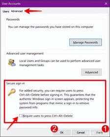 用户账户面板将出现在屏幕上。单击“高级”选项卡(如果默认情况下未加载)。找到“安全登录”下列出的“要求用户按 Ctrl Alt Delete”选项。选中启用或取消选中禁用。