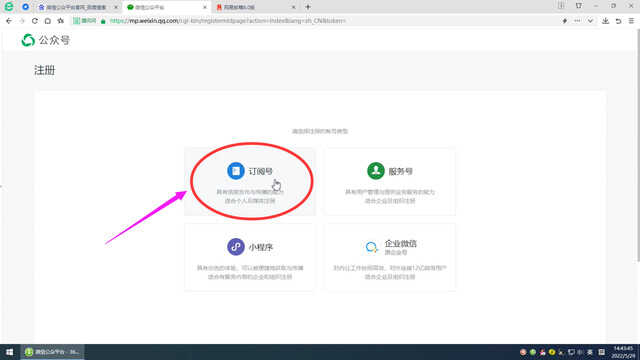 (3)进入注册页面以后,有几个选项可以选择,个人选择订阅号,企业或组织选择服务号,然后选择订阅号点击进入