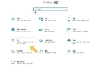 进入电脑系统“设置”界面以后,在弹出的界面里找到“帐户”。如下图: