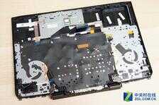 可以看到一共有3根8mm散热铜管同时负责CPU与GPU的散热,其中CPU与GPU共用一根8mm铜管,也就是说CPU与GPU实际分别有两根8mm铜管导热,同时显卡部分覆盖供电电容与显存芯片的部分还有一根6mm铜管辅助导热,比普通游戏本的散热模组豪华了不少。