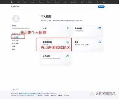 完成初步注册后,就最近我们Apple ID管理页面,点击“个人信息”再点击“国家或地区”