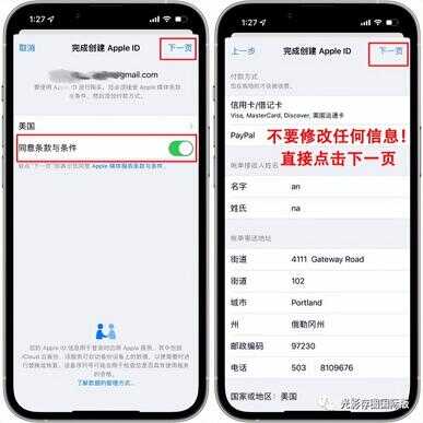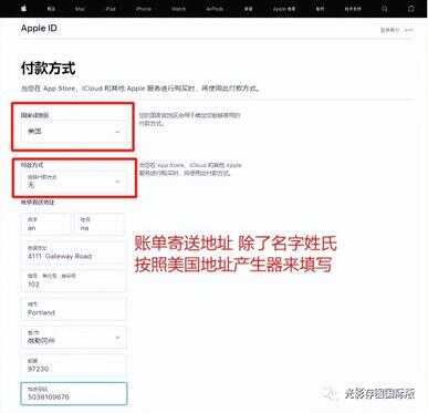 在国家或地区中我们选择“美国”,付款方式选择“无”,账单寄送地址要填写美国的地址,这里我给大家一个美国地址产生器的网址,大家直接在网址中就可以获取美国地址。要注意因为美国有部分州是收税的,大家在地址产生器中可以选择俄勒冈州,这个州是不收税的,也能避免之后在App Store中下载app收税。