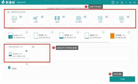 步骤一:如果你丢失的存储设备是外接硬盘,那么将外接硬盘和电脑连接;如果你丢失的数据位于电脑中的磁盘,那么你就可以直接单击图标,运行软件,在首界面选择丢失文件的路径和类型,选择丢失分区数据的硬盘,选择丢失文件的类型(全选文件类型可以更好地扫描硬盘的数据)。完成选择后,单击右下角的扫描,让软件进入快速扫描阶段。