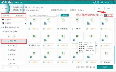 步骤二:在快速扫描中,左侧可以根据类型和路径查看文件,单击文件类型,可以查看该类型的文件,将鼠标悬浮在文件上查看文件的详细信息,在上方的右侧红色框中可以查看图标。在上方可以查看文件扫描的进度。完成快速扫描后,可以在扫描框上方的深度扫描框单击进入深度扫描。