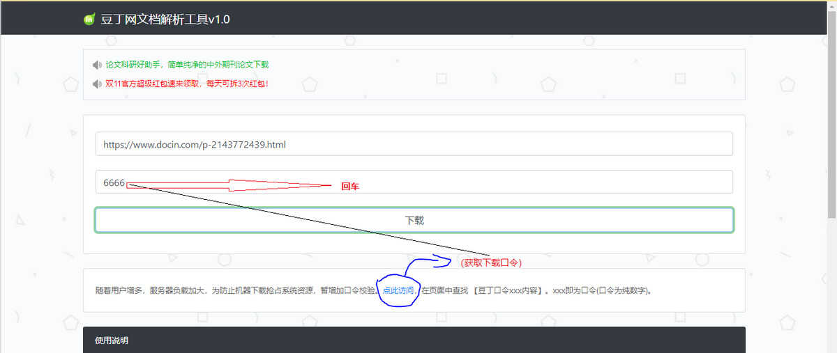 直接打开这个https://www.docin365.com/,然后复制一下你需要下载的那个页面链接,粘贴输入豆丁下载口令回车解析。