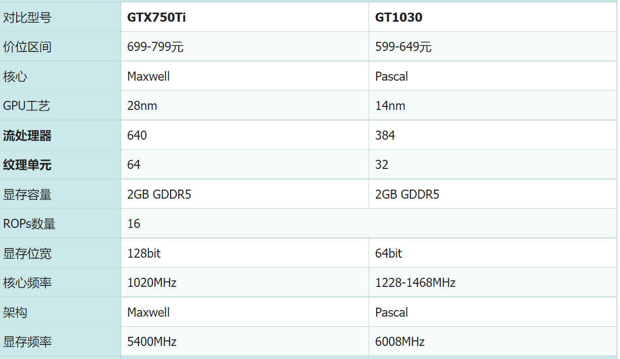 估算显卡的性能 ,首先要看架构差异,然后再看核心,显存等部分,Pascal架构和Maxwell架构相比,单位核心的同频性能并没有很大的提升,而GTX 750Ti的流处理器是对方的2倍,而且显存位宽也是2倍。