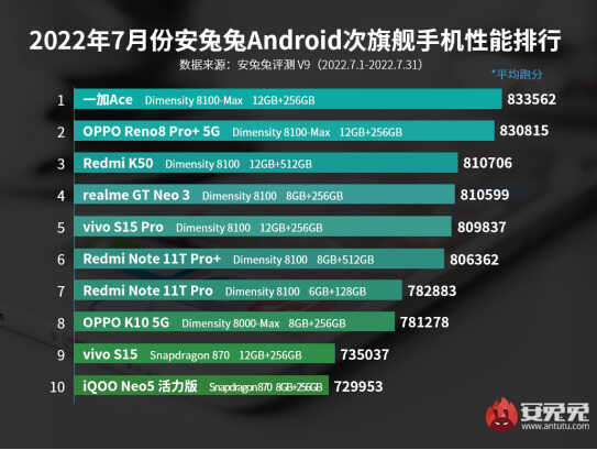 近日,安兔兔发布了2022年7月份安卓旗舰手机性能排行榜,虽然榜中有不少新机,但是我们可以看到,在排行榜前十中,搭载骁龙8+芯片的手机几乎霸榜,唯一一台搭载天玑9000+芯片的小米12Pro天玑版还排在第十。