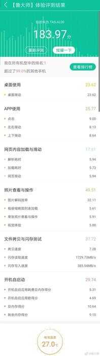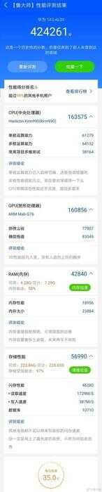 从鲁大师公布的数据来看,麒麟990获得了424261分的成绩,该成绩与骁龙855和骁龙855+属于同一级别,位列性能得分榜的第六名。在体验评测结果方面,麒麟990以183.97分的成绩位列该榜的第一名,说明麒麟990在实际使用时的体验基本是目前顶级水准。