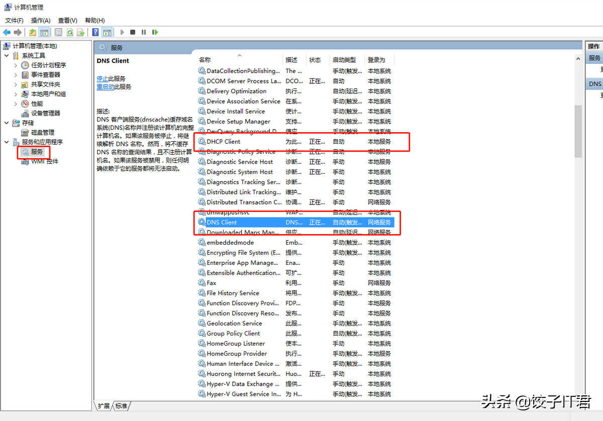 点击服务——查看DNS Client 和 DHCP Client 这两个服务是否打开