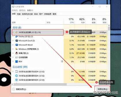 第三步:在任务管理器可以看到后台的运行任务,点击想要结束的任务,直接按右下角的结束任务即可。