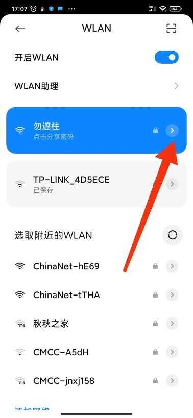 第一步,点开手机的“设置”,进入“WLAN”,找到手机连接上的路由器账号。