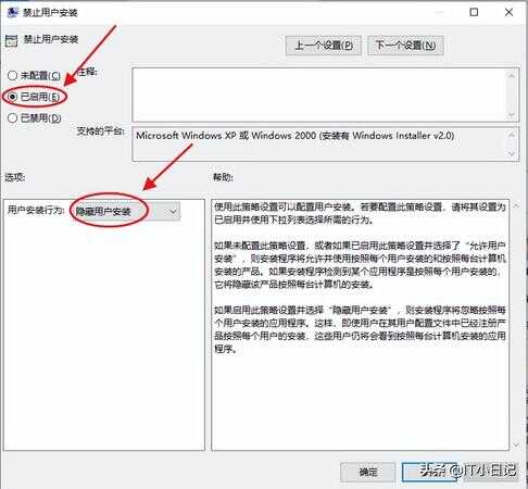 5、双击打开“禁止用户安装”,上面选择“已启用”,下面选择“隐藏用户安装”,应用》确定即可。