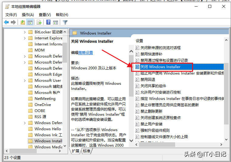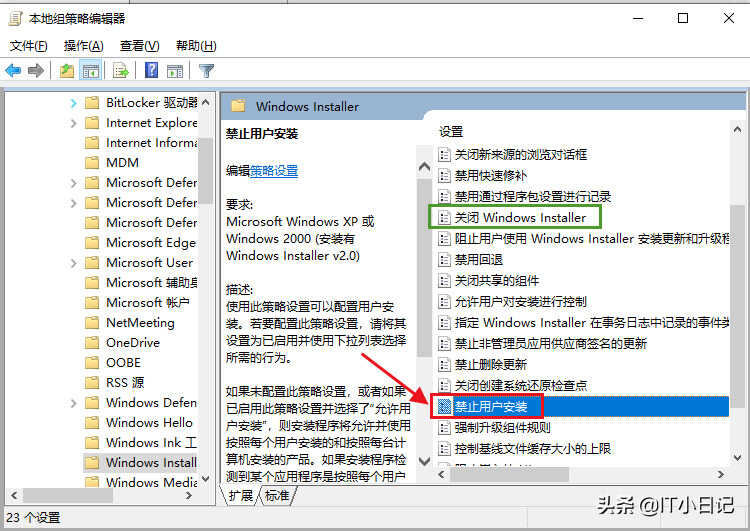 4、在“关闭windows installer”下面找到“禁止用户安装”。