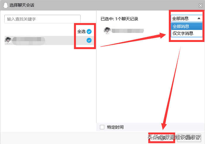 步骤二:在“选择聊天会话”的窗口勾选需要恢复的联系人的聊天记录,再进行选择恢复全部消息还是仅文字消息,最后点击“恢复”。