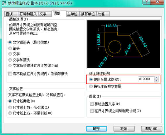 2、点击修改后弹出【修改标注样式】对话框,点击【调整】,在右边图片的下方有个【标注特征比例】,选择【使用全局比例】,把右边的数字调整到适合的大小后,点击【确定】 ,如下图所示: