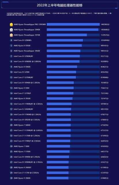 近日,鲁大师2022年半年报发布了PC硬件排行。排行数据包含2022.01.01—2022.06.30日鲁大师PC正式版测试数据。其中,PC处理器性能排行榜中,AMD依旧以王者姿势稳坐钓鱼台,任凭英特尔紧追不舍,依然拿下冠军。