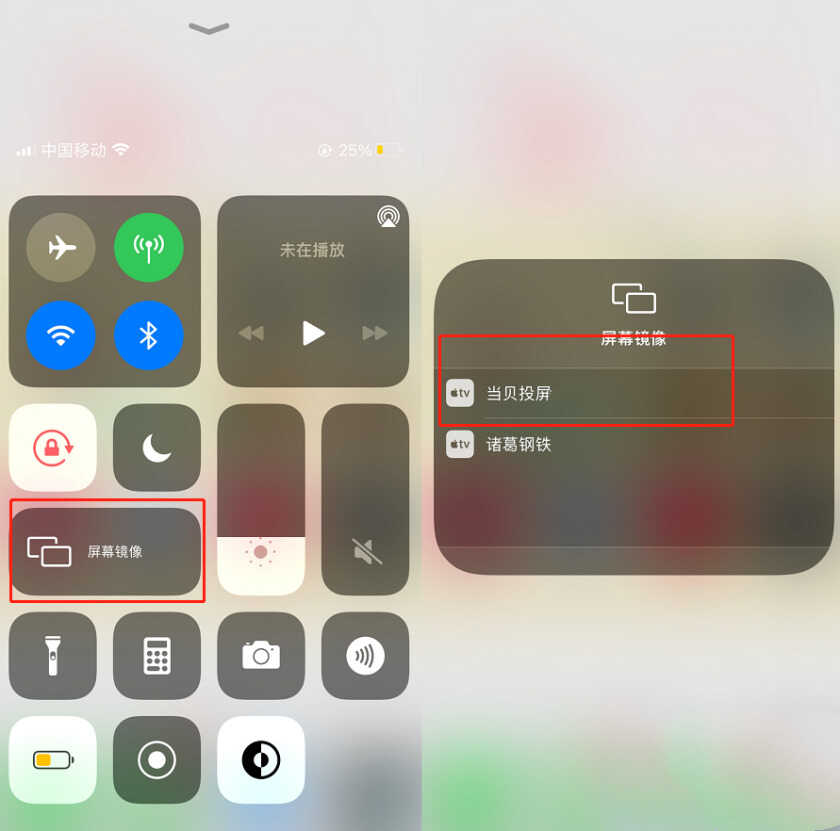 2、在苹果手机中下拉功能栏,点击屏幕镜像,找到当贝X3投屏名称,连接即可。
