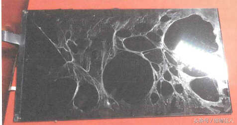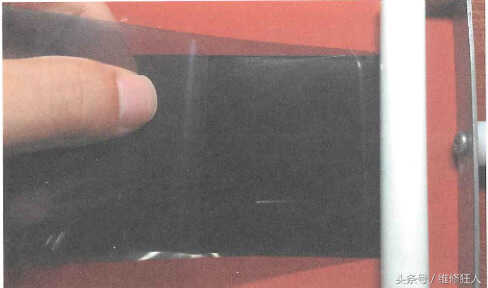 铲到靠近排线约2mm的位置,停止操作。用手撕去剩余的部分,防止操作不当铲坏排线。偏光片上的余胶比较难处理,清理偏光片上的余胶必须使用偏光片专用除胶水,如图