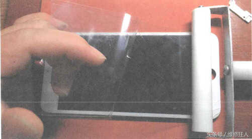 拆下手机屏幕后,要更换屏幕玻璃盖板,需要对屏幕进行分离。由于这张屏破损比较严重,用真空分离机吸附盖板时,破损处会漏气,固定不了屏幕。先用一张OCA胶把破损面粘上(破损不太严重的屏幕可以用透明胶带处理),如图所示。