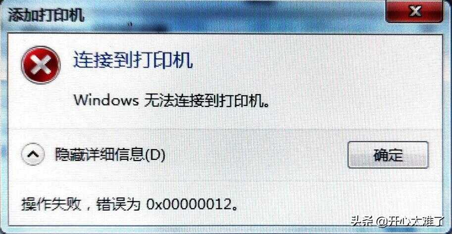 今天连接一台网络共享的打印机,遇到了一个错误“windows无法连接到打印机”,操作失败,错误为0x00000012。关闭了“防火墙”,重新安装驱动程序,安全权限也修改了,都没有解决问题。郁闷了好久。
