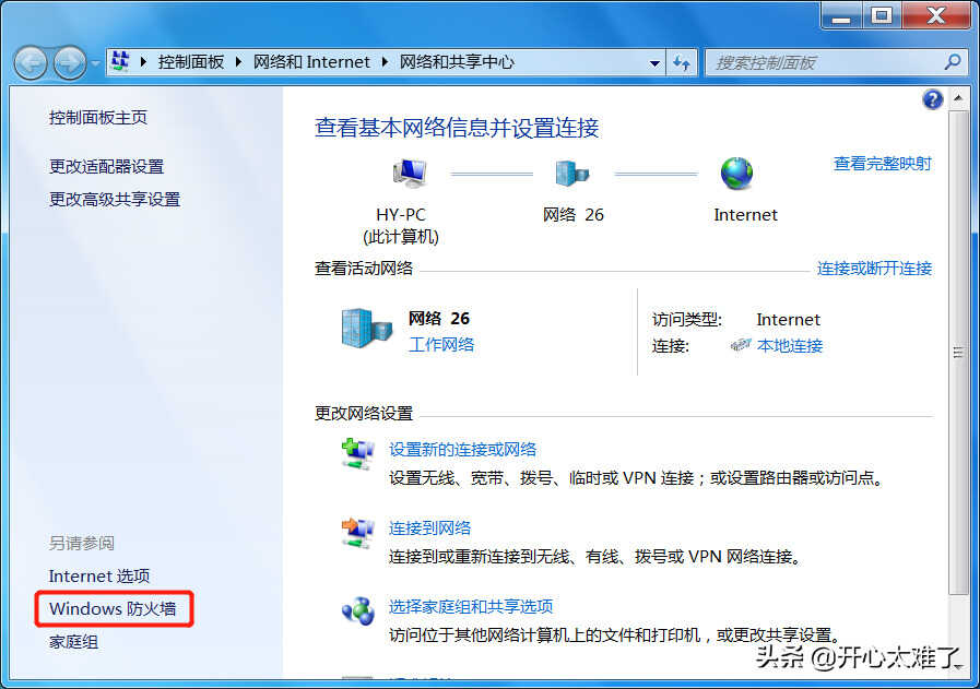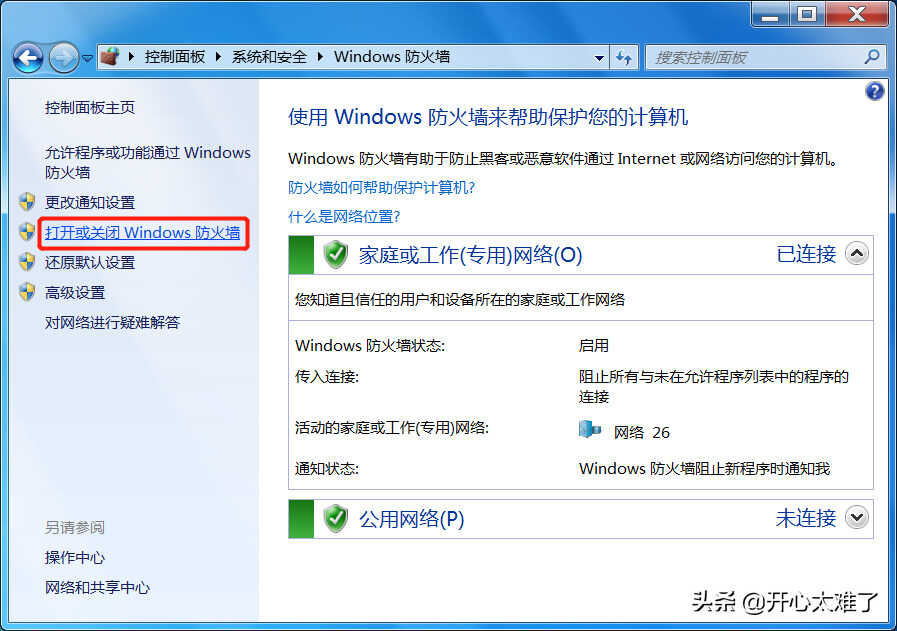 顺便说一下怎么关闭网络防火墙吧,这个也是共享打印机不能连接的一个主要原因。首先打开“控制面板”,然后点开“网络和共享中心”,点击下面的“windows防火墙”。