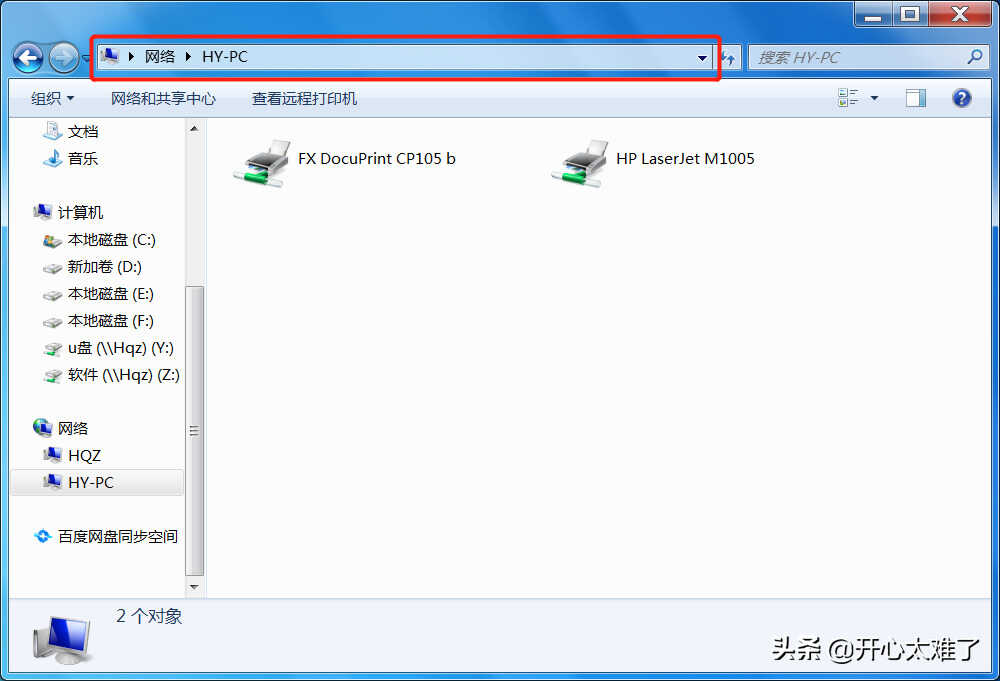 打开这个计算机以后,点一下地址栏后面的空白处,就看到这个网络地址了。把这个地址复制粘贴到添加凭证网络地址的输入框里面就可以了。顺便说一下,双击下面的打印机图标也可以直接连接添加共享打印机。