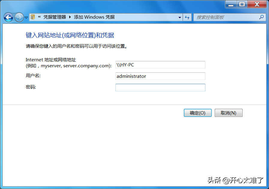 在这里输入“网络地址”“用户名”和“密码”。然后点“确定”就完成了。不知道怎么查找网络地址的小伙伴们往下看,后面会介绍怎么查找网络地址。用户名填写提供共享打印机电脑的管理员用户名,一般默认是Administrator。在提供共享打印机的电脑上查看。密码就不用说了吧。