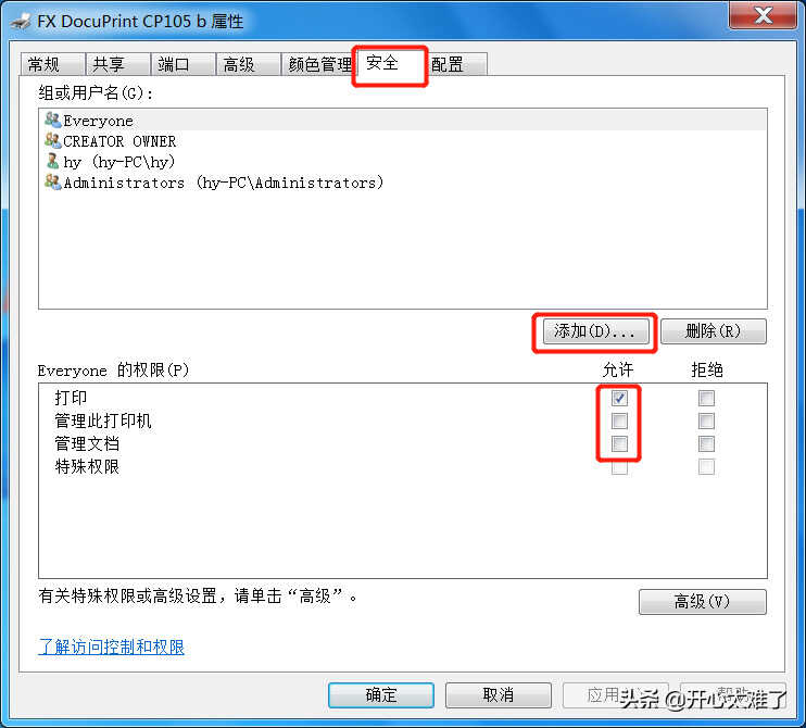 在打印机属性中,点“安全”选项卡。点“添加”,添加用户或组。