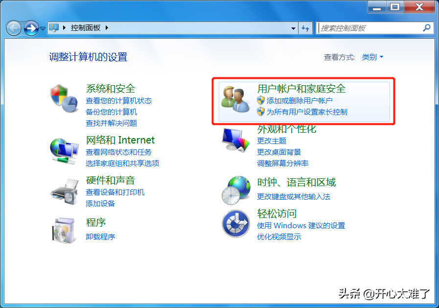在需要添加共享打印机的电脑上,我们先打开“控制面板”,然后再打开“用户账户”。