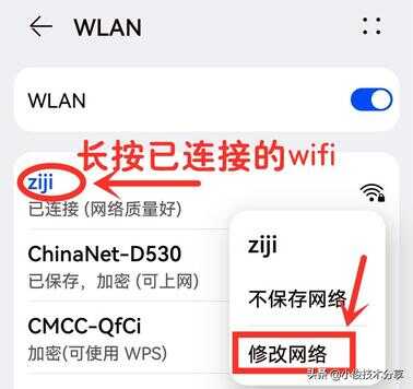 接着就会打开【wifi】连接设置页面,在这里可以看到手机已经连接上的【wifi】,我们长按这个wifi,然后选择【修改网络】