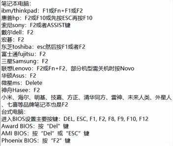做电脑维修维护运维相关工作,免不了进入电脑BIOS调试软件硬件设备,我结合以前修过的电脑的经验,再从网上找寻相关的技术资料,和朋友们一起学习交流:各个品牌/组装机电脑进BIOS方法