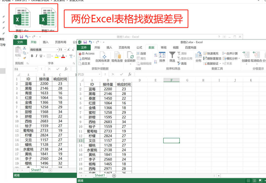 如上图所示,我们文件夹中有表格1、表格2两个表格文件。两个文件中的姓名对应的可能会有不同。所以在这里我们需要去复核2张表格中,差异的人员有哪些。这种差异数据对比看起来很复杂,其实我们用简单的一个vlookup函数就能搞定。