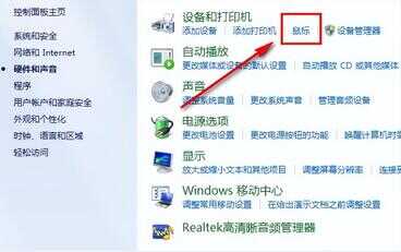 2. 打开“鼠标”属性“类别” 视图下点击“硬件和声音”找到“鼠标”)
