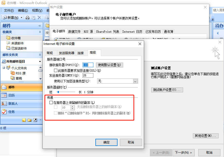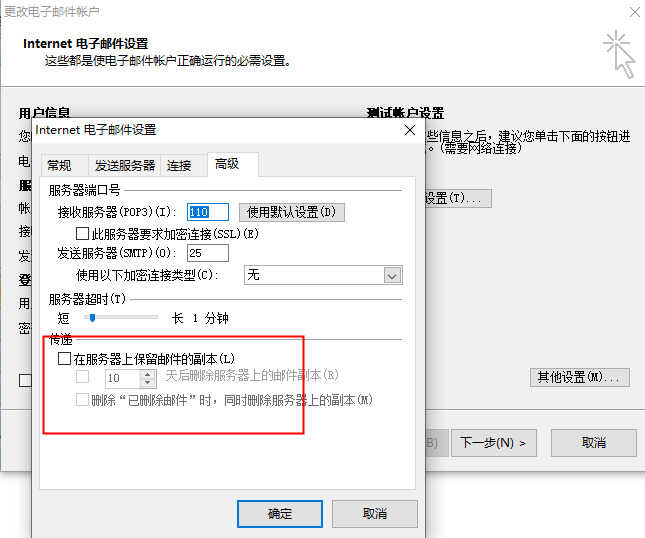 勾选“高级”的,在服务器上保留邮件的副本,这样服务器上的邮件便不会被删掉了。