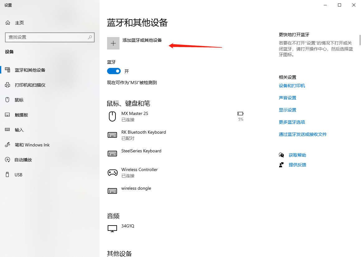 如果你的电脑本身支持蓝牙或者购买了蓝牙接收器,那么在系统的右下角就会有一个蓝牙标志,双击这个按钮打开蓝牙设置窗口,然后点击“添加蓝牙或其他设备”这个按钮即可。
