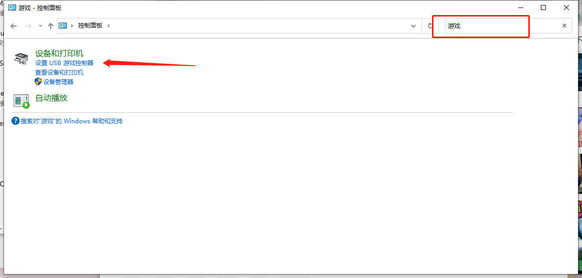 我们打开控制面板,然后在右上角的搜索框中输入游戏,即可看到在窗口左侧出现了“设置USB游戏控制器”这个选项,然后我们单机这个设置项,