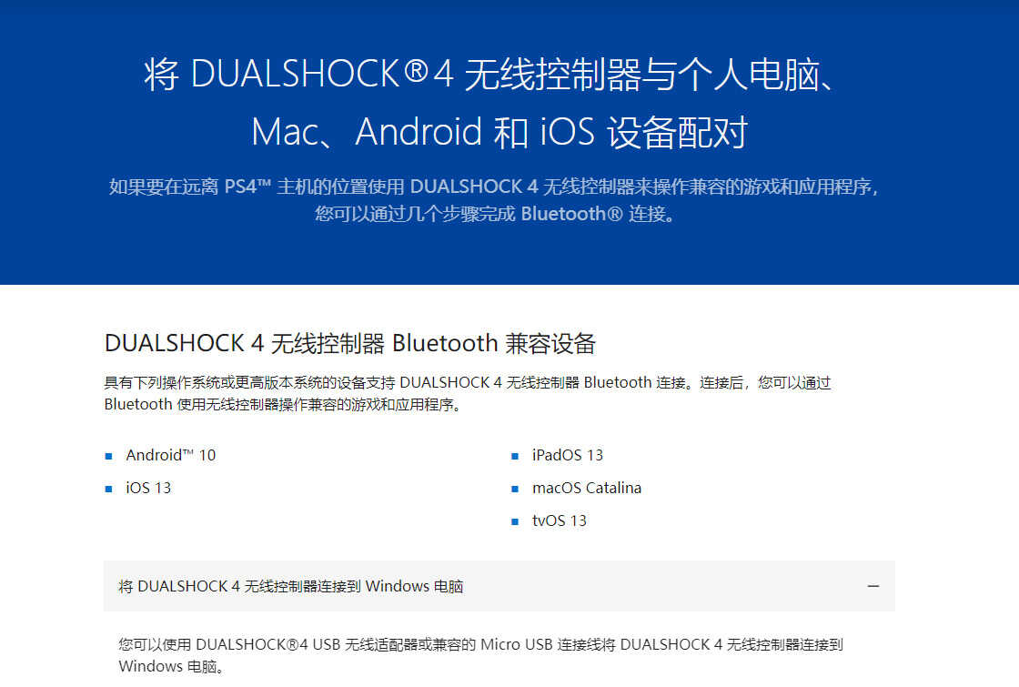 目前的PS4手柄可以完美的兼容Win10系统以及其他诸多移动或电脑系统,譬如IOS,安卓,IPadOS,Mac OS等等,关于这方面的消息我们其实可以在索尼的官方网站上就得到较为详细的介绍,如下图所示: