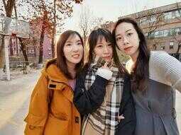 (三人超广角自拍,大画幅轻松容纳三个人半身,背景留白空间充足)
